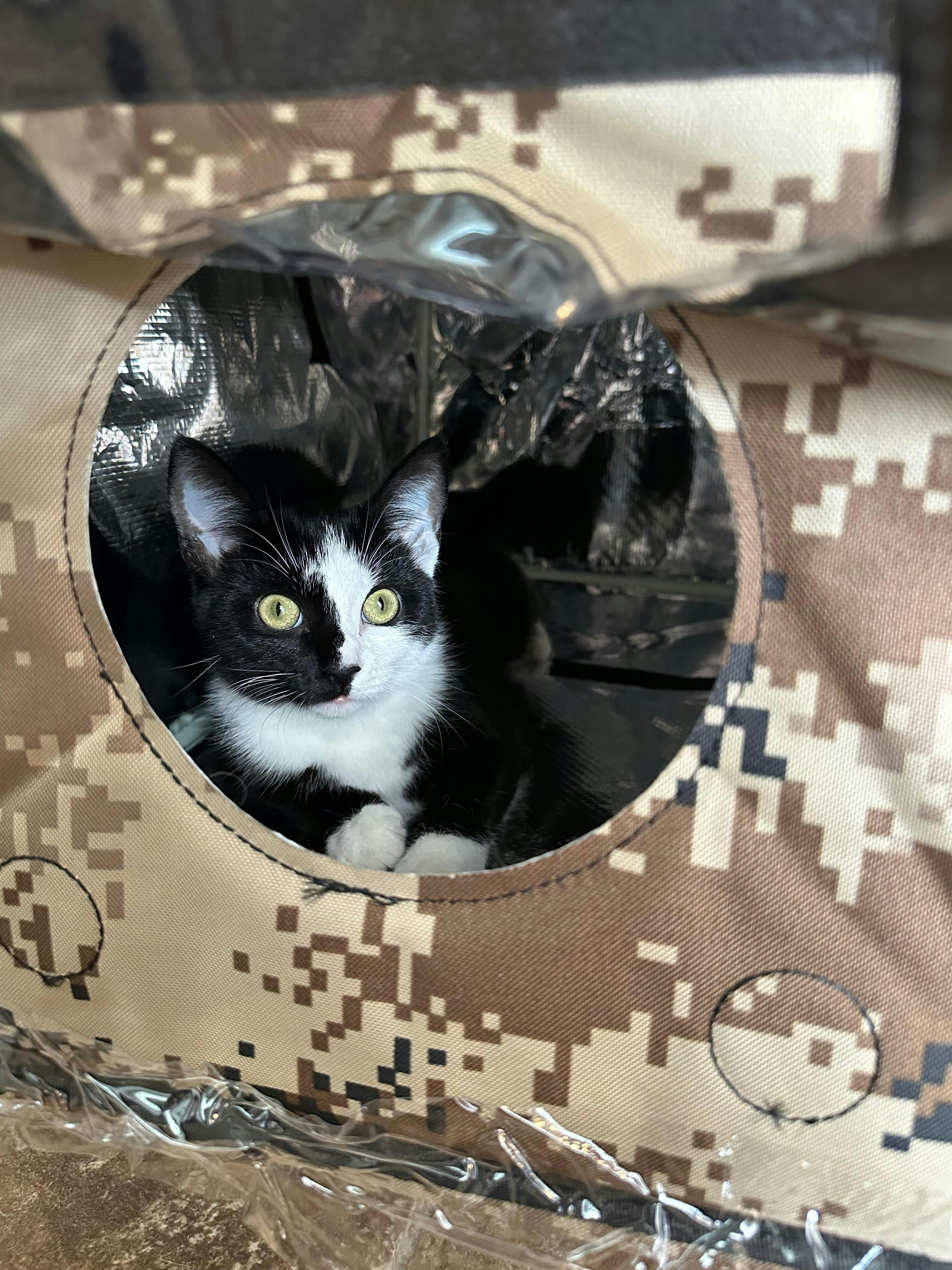 I will be purchasing another heating pad & cover, just to have on hand & keep things fresh. Here's a pic of one kitty peeking out. The cardboard boxes are now gone!! Yay!